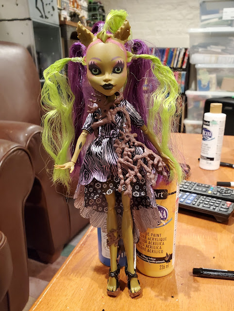 Treesa's mechanical novelties were cool, but I never liked her character design. It looked bland and sweet, much more like a basic-tier Ever After High doll, down to her body being like a more branched version of Cedar Wood's grained wooden sculpts. Treesa was not a classic spooky tree. She was a dryad pushed into the least scary incarnation of Monster High. So I thought Clawvenus could give me the scary tree monster I wanted. Doesn't mean I'll never get Treesa. But if I do, it might be to make over as a display curio unrelated to MH.