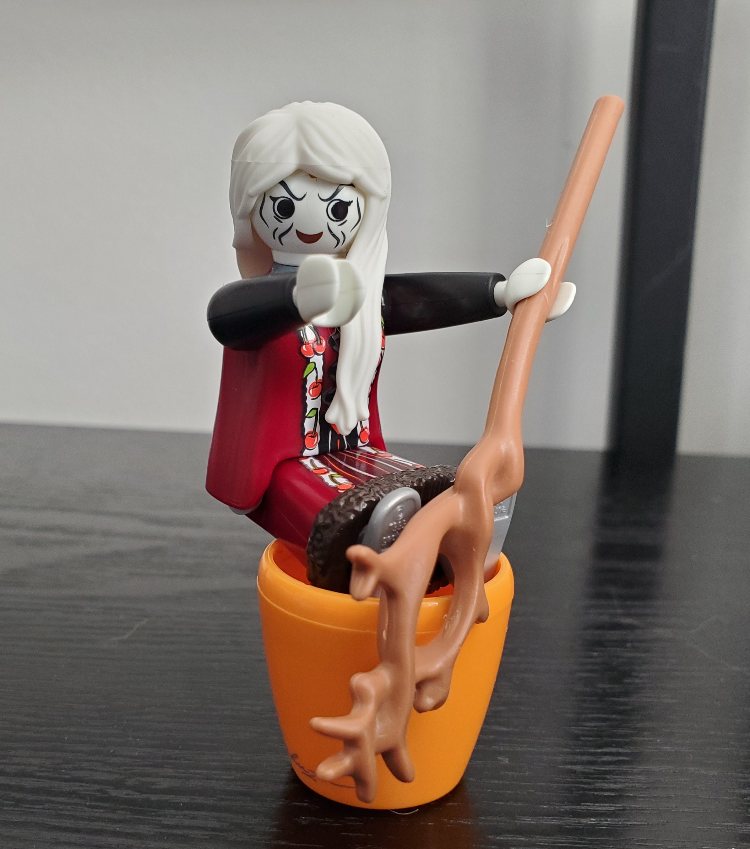 For a mortar, I had to improvise and order a large flower pot piece I didn't think would clash with her colors or the concepts. It's not ideal, but it's the only Playmobil part that works. For her pestle, I gave her a tree staff without a gemstone to make her look more gnarled and woodsy.