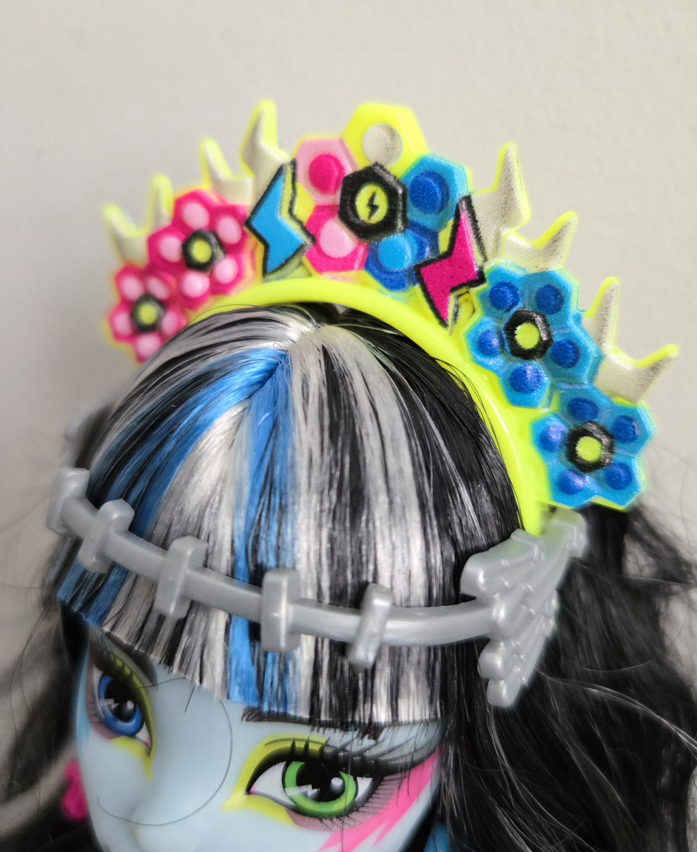 The Monster Fest dolls start with their bohemian music-festival aesthetic through fancy tiara headbands, which all feature a forehead-crossing circlet section that evokes hippie attire. I assume this is all a legacy of the original heyday of Woodstock. The main deluxe dolls combine the circlet with an arced headband, but Draculaura in the food truck playset just has a circular tiara. Frankie's tiara is neon yellow with a flower design formed of hex bolts and lightning, and features a silver forehead circlet that looks like stitches, with safety pins at the side.
