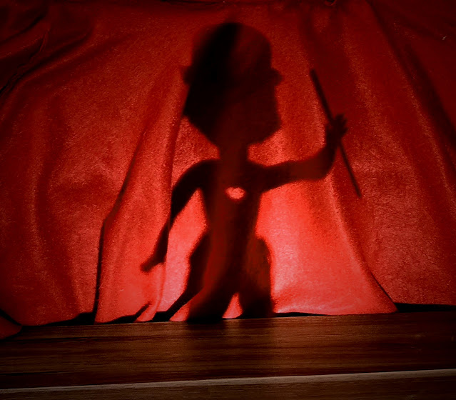 I also thought Maitre des Morts could use his torso as a light focuser to create the Moulin Morgue's stage spotlight for other performers! I set this up with a headlamp on a box of pencils.