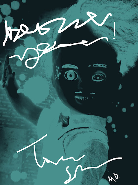 With this series, as with Series 23 (read that project in one go here if you like, or search through my post list at the top bar for the original non-linear edition), I ended up creating formulaic art concepts to explore and return to with each doll. I had several more series of pictures for Series 5-- the celebrity news item(s), the performance advertisement, the professional appearance, the autographed picture, the physical signed footprinted slabs, and the autopsy photos with Tinselton.