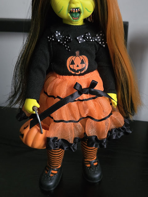 I think purple accents and less green would help this doll, or conversely, eliminating the orange altogether. Jack O Lantern's equivalent variant (which was the Australian edition on him) mixed purple and green. (His white variant was the US edition and his orange/black variant was the UK one). I think this variant of Sweet Tooth would look great under blacklight, but I'd get more mileage out of this by customizing her hair and paint to ditch the orange. She could be a witch or some other flavor of generic Halloween spook with this setup.