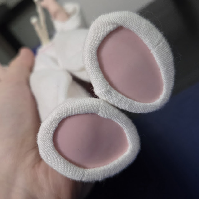 Eggzorcist was the first LDD without shoe pieces, given her footie suit. I expected the feet to be fully white fabric, but I was very pleasantly surprised to find pink soles here too--and moreso because of how they were done!