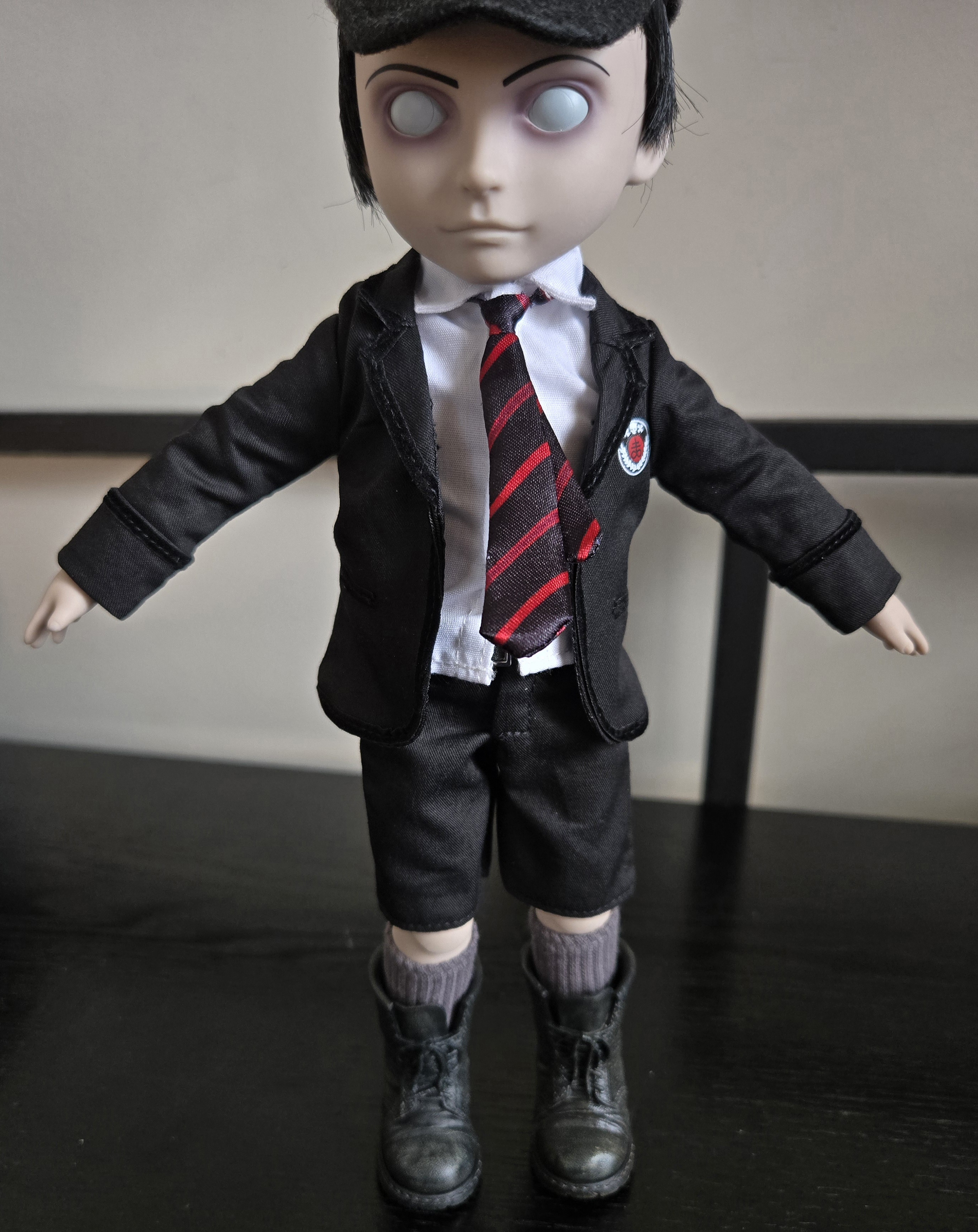 Living Dead Dolls Damien has a clear concept beyond just being a spooky boy who could be Sadie's brother. (And just to be clear: he's never said nor implied to be. They just look like plausible siblings.) Damien's concept is that he is blatantly based on the character of Damien Thorn from The Omen, to the point where I'm astonished Mezco never got threatened by legal and the LDD character has persisted thus far without ever becoming less obvious.