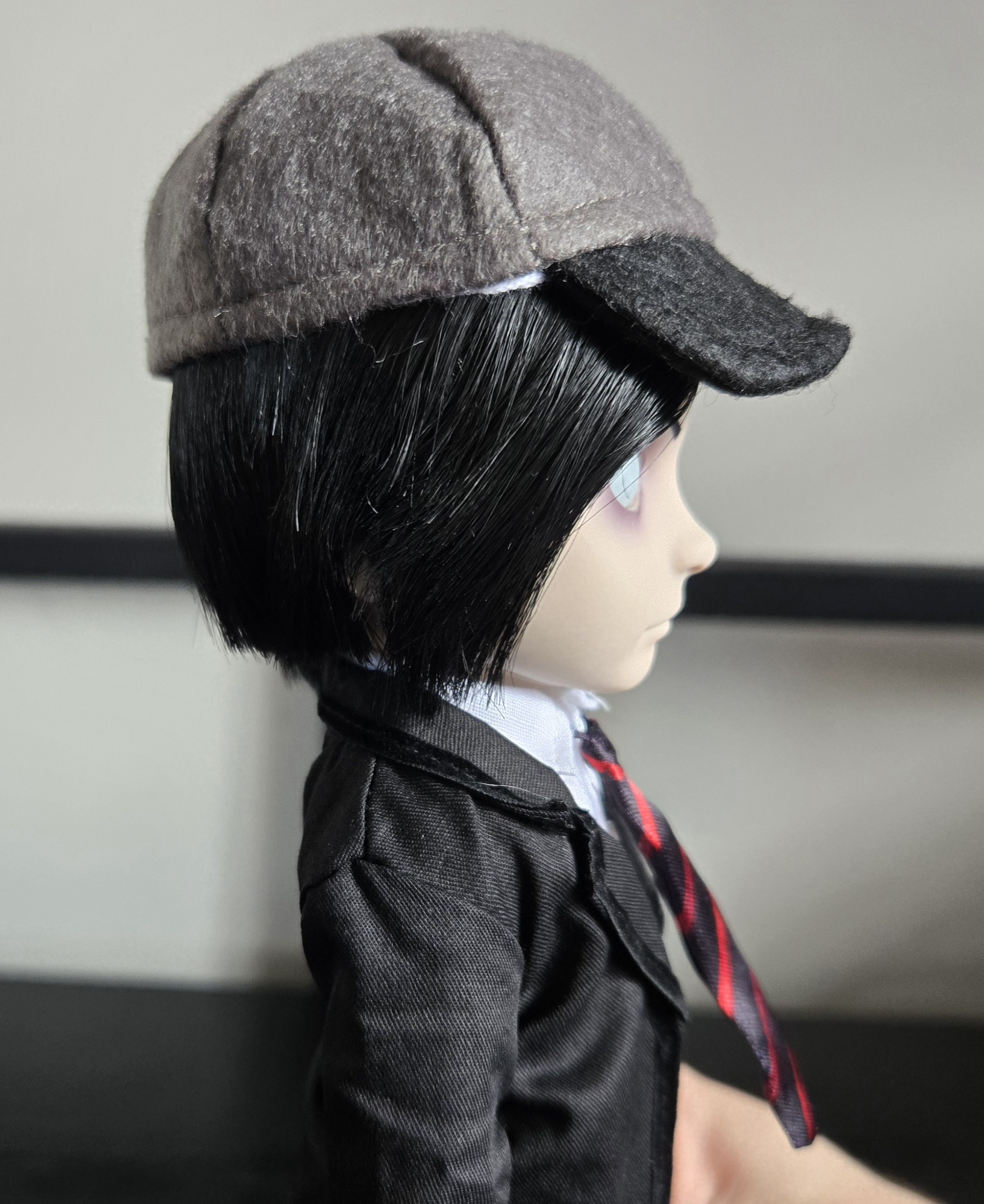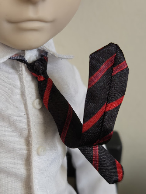 This "Ken doll cut" of the lower layer makes him less displayable without his jacket, but there's a charm to it given the doll's overall aesthetic. The necktie is proportionally shorter than the Return doll's, but the Return doll looks a bit more grown, anyway. The inner seams of the collar area are poking out in a distracting way that might call for trimming. On the shorts, a belt has been suggested with a clumsy band and buckle made from the same black fabric, which, like the hair situation, is really crappy in a very darling way.