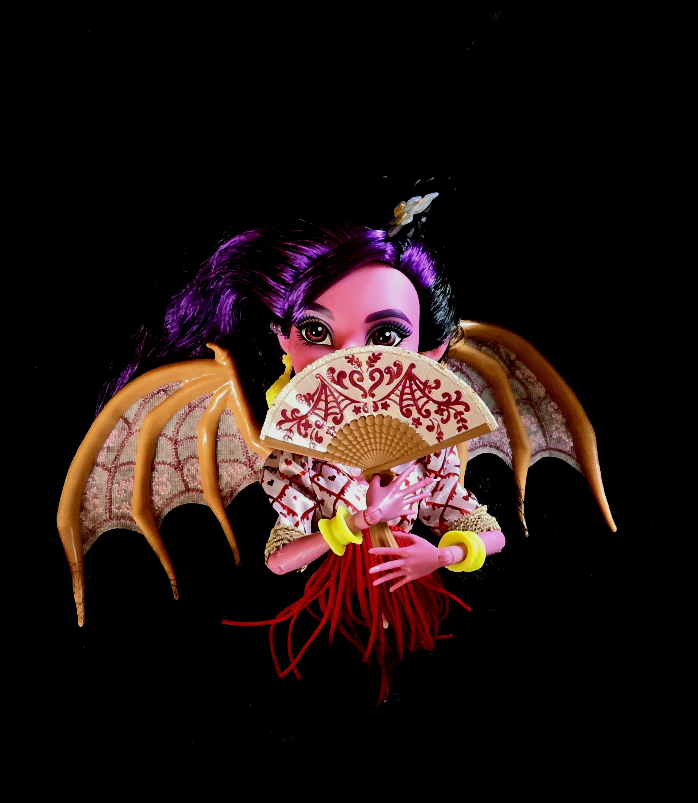 The waist split is unusually visceral for Monster High, though still done with some restraint and implication. MH's furthest extreme still lands on "creepy anatomical" instead of "gore and brutality". Previous Monster High dolls with visible internals were River Styxx, the Inner Monsters, and Symphanee Midnight, but through translucent outer body parts. I still feel like Cora here is significantly rawer, seeing bone in the severed torso half. It feels like it's not supposed to be seen, in the way a gory injury feels, not like something matter-of-fact like translucent parts over internals. The costume design also alludes to the gory factor of the manananggal, as the fringe on the waist not only blends the two-part outfit together, but also invokes the imagery of the manananggal's dangling entrails! Monster High designers, I see you. I see the twisted passion you so want to produce. I see the horror fun you want to embrace. I see the G1-style boldness you're not permitted in G3! (Don't tell me Cora wouldn't have been possible, in cheaper form, as a bolder playline G1 doll from Monster Exchange.) I'm glad collector dolls are an avenue you can express the creepy stuff through, MH team. I just wish they were more accessible!
