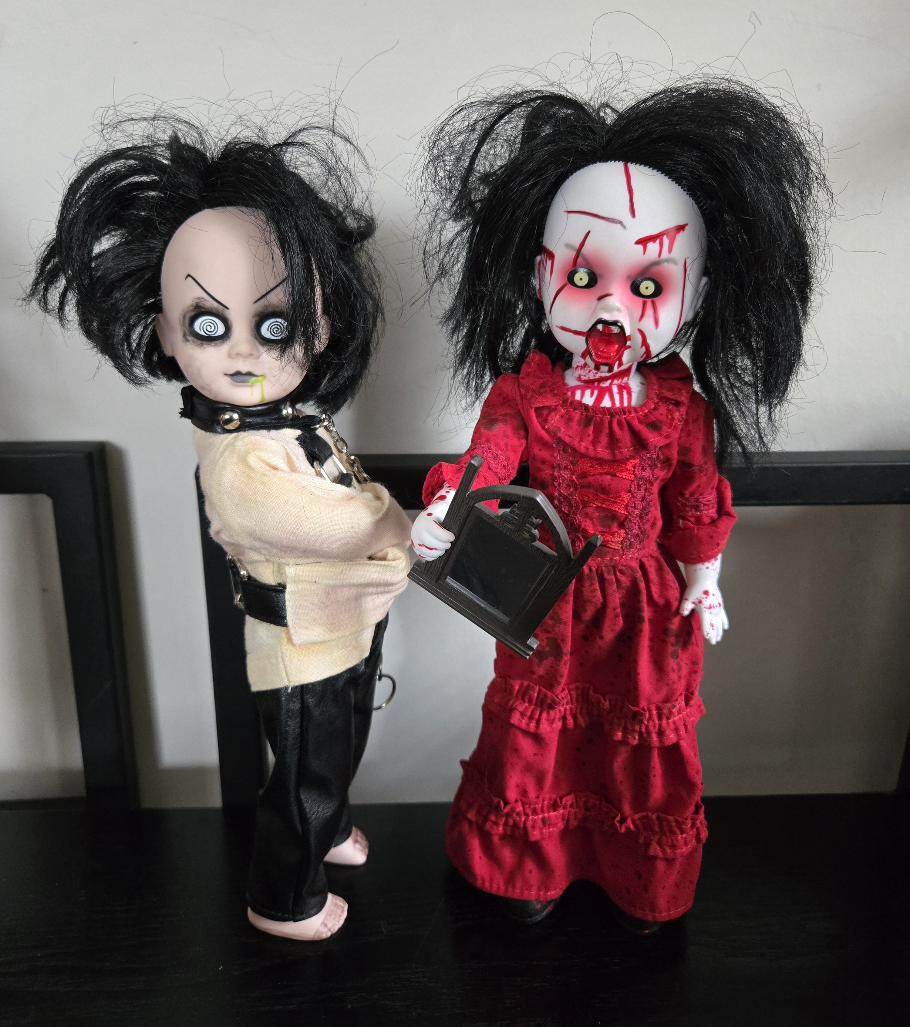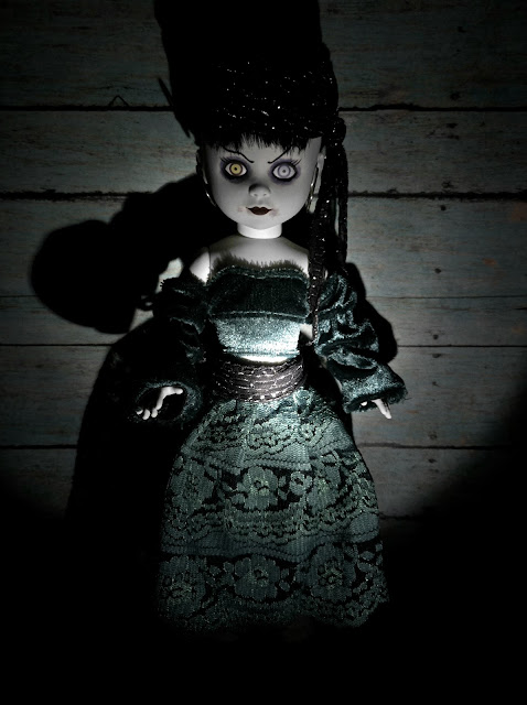 EDIT: The owner who photographed the Resurrection Lusts unmasked did some custom work which misled me. While the hair makes perfect sense, both dolls are officially bald, which makes sense because they need to fit in their cowls. Of course the hair wasn't official-- though it looks good on them. Previous LDD nun character Bad Habit was bald for the same purpose.