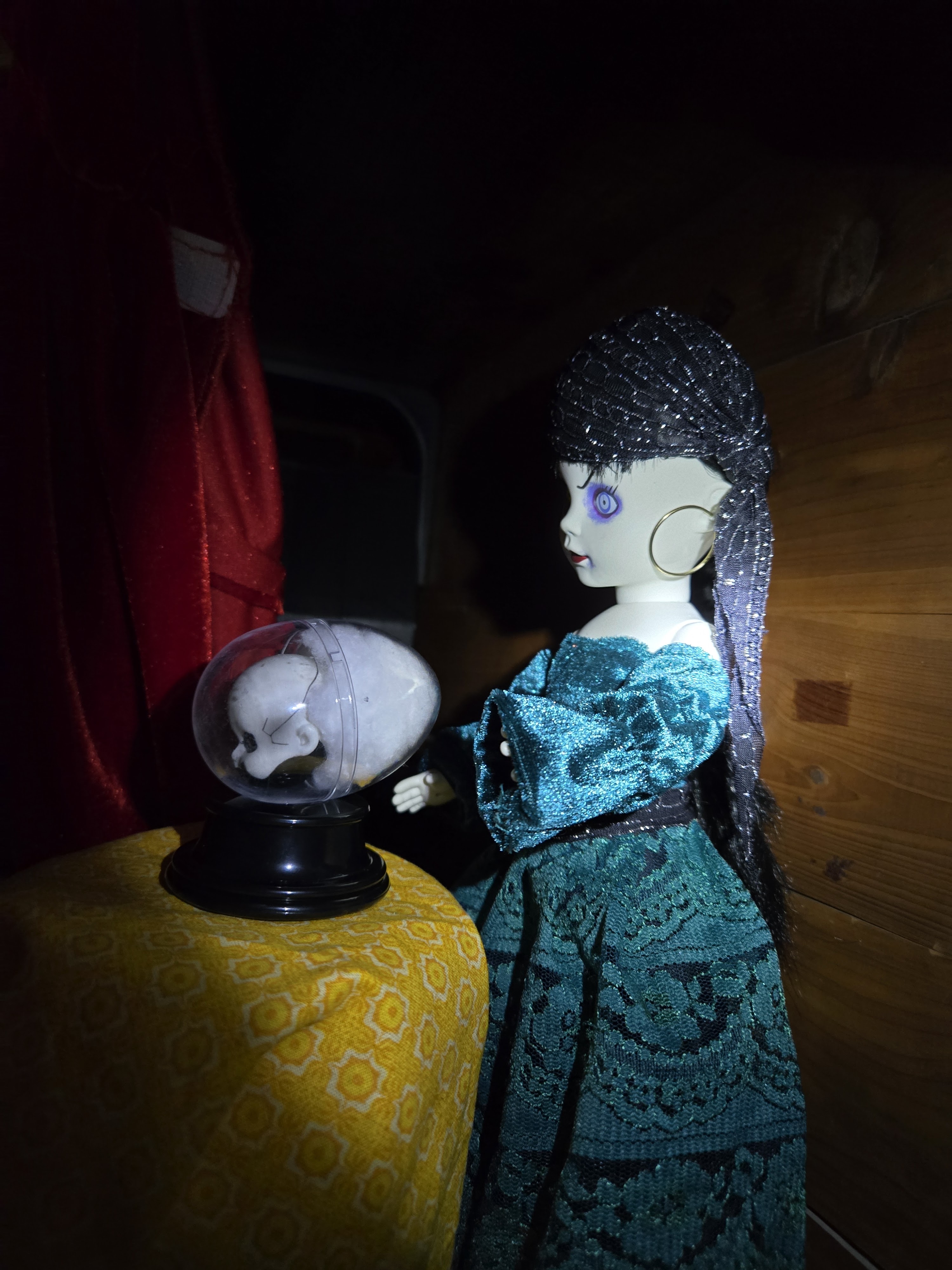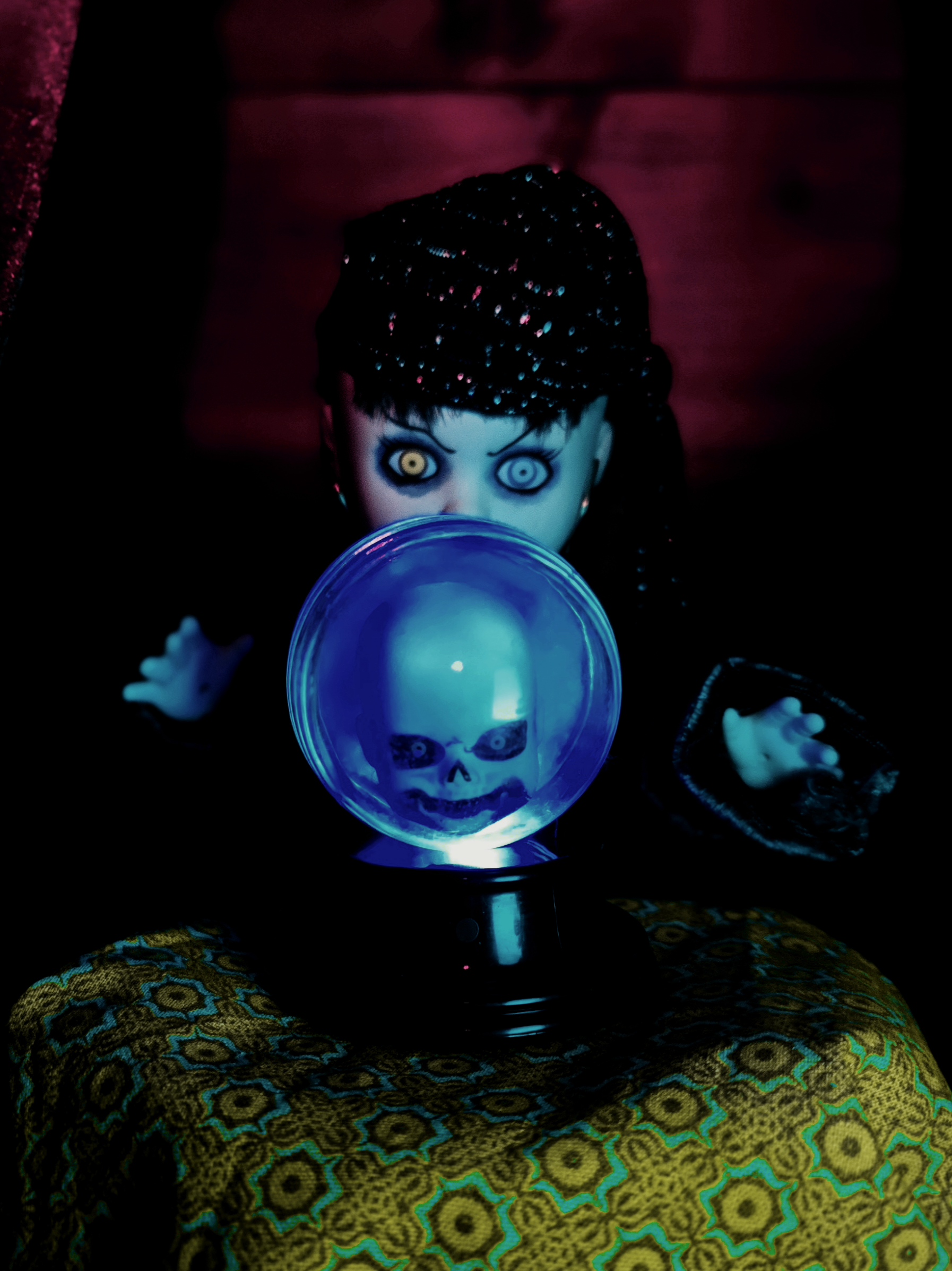 One thing slightly unusual about this doll is how youthful her design is. Typically, the Romani fortune-teller archetype is elderly or middle-aged. Possibly another unusual thing is how pale she is, though Romani people do not have a universal skintone and are not all visually in the "brown" range. I think LDD Gypsy's stark white is acceptable pallor and stylization...but it can still feel telling of LDD just not being interested in depicting darker skintones whatsoever. Only Macumba and LDD Presents' animated Gomez Addams are both explicitly non-White and also have darker human flesh tones. Demonique is an optical mess to parse out who I'd like to tackle next time. None of the Mexican dolls from Series 20 or Calavera are darker than White tones, Wurm in Series 30 was inspired by a darker-skinned Guyanese man but is given a fantasy green color, and even all of the dolls who are Asian or are possibly Asian-coded are all stylized fantasy skintones rather than flesh colors. At a certain point, it becomes a choice to not depict Black, Brown, or Asian people, or to not ever depict them with human colors. That really sucks and it's a horrible pattern, regardless of awareness or intent on the part of the designers.