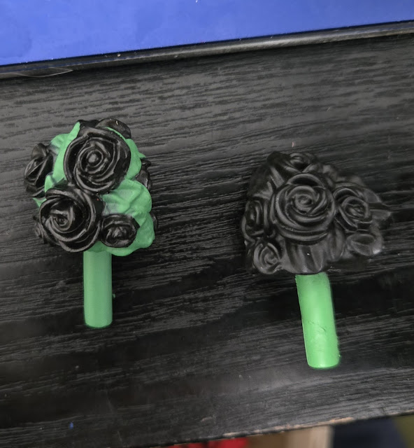 I then wrapped the Return roses with black wire to give them a grip handle the Girl's hand would actually clip firmly onto, since they were begging to tip and fall out of her hand.