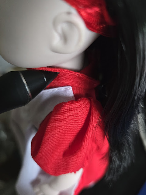 The headband is a joke, which I should have expected after seeing Alice's contemporaries Rose and Violet. It's a red satin loop with some gathering and elastic at the back to give it stretch, but LDD has again tried securing a headband loop on the back of the head where there is absolutely nothing giving it tension. A doll's chin can stick out and catch a band against the top of the head, but there's no "shelf" at all on the back of the LDD head sculpt which the headband can brace against and stay tight with securely. It always wants to slip backward and fall down off the hair. This should have been a plastic piece shaped as an arc that hugged the top of her head like a real headband would, because this is frankly delusional. How did Mezco think this piece would work? I was able to replace Rose and Violet's useless ribbon headbands with wire arcs that held their hair bows on and slipped over the top of the head, but that's not an option for this style of piece.
